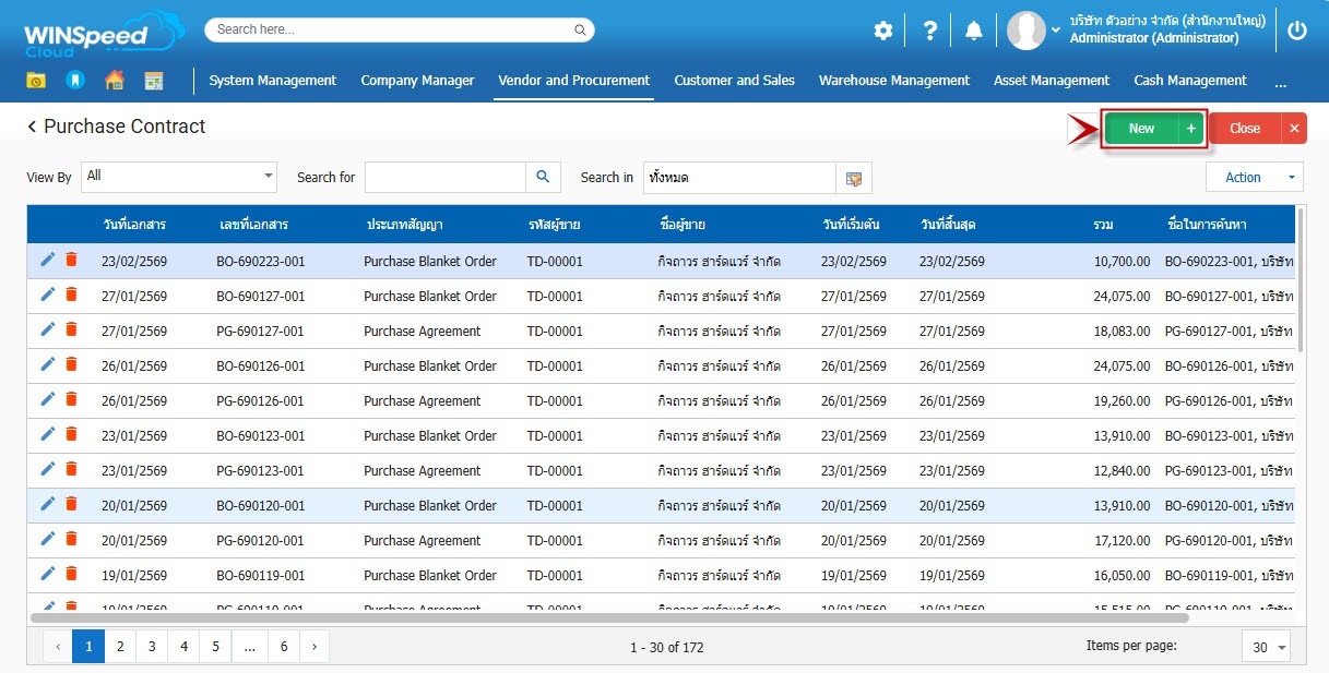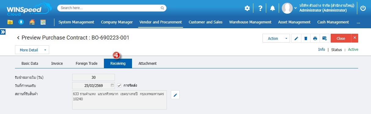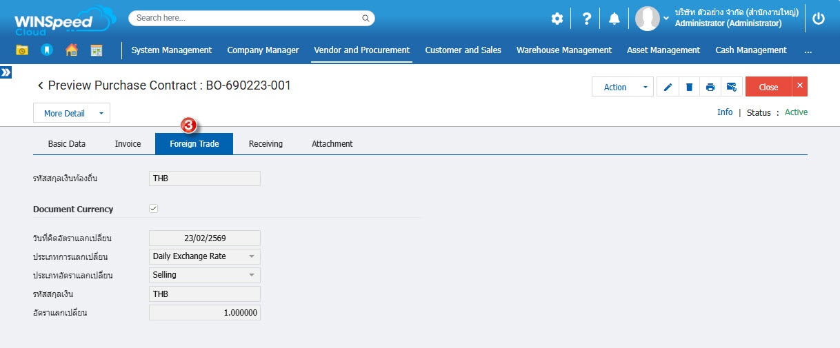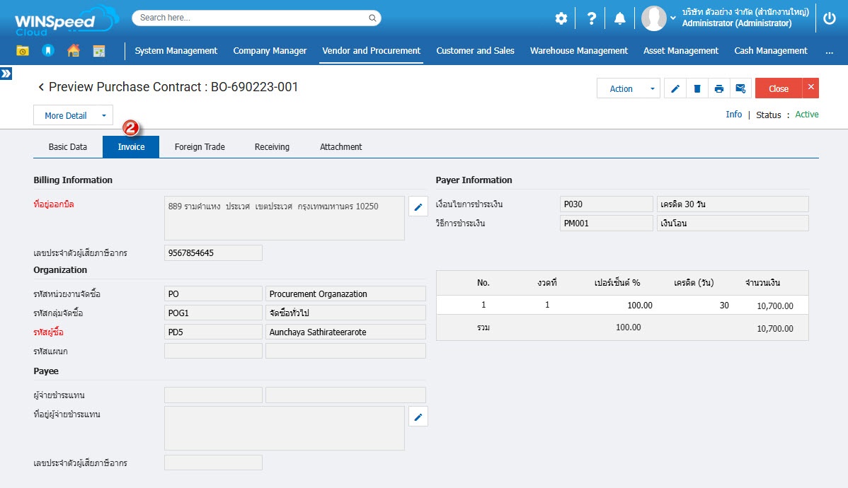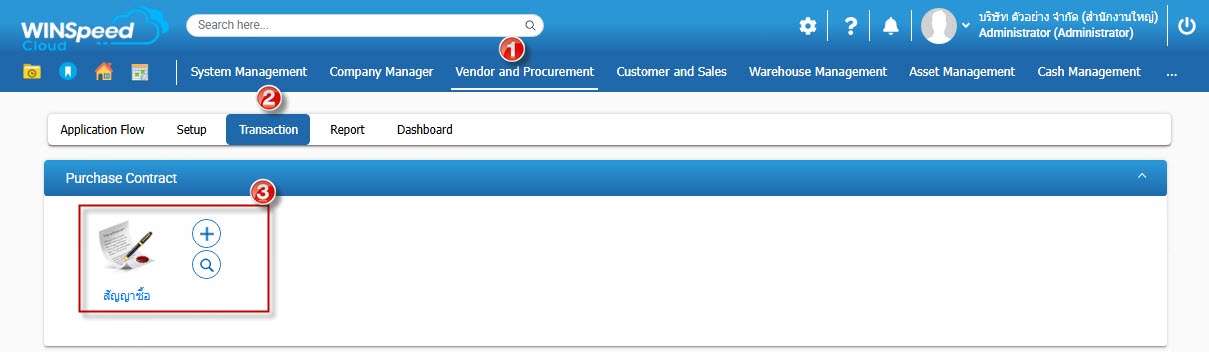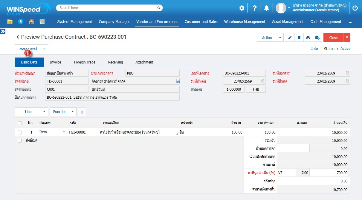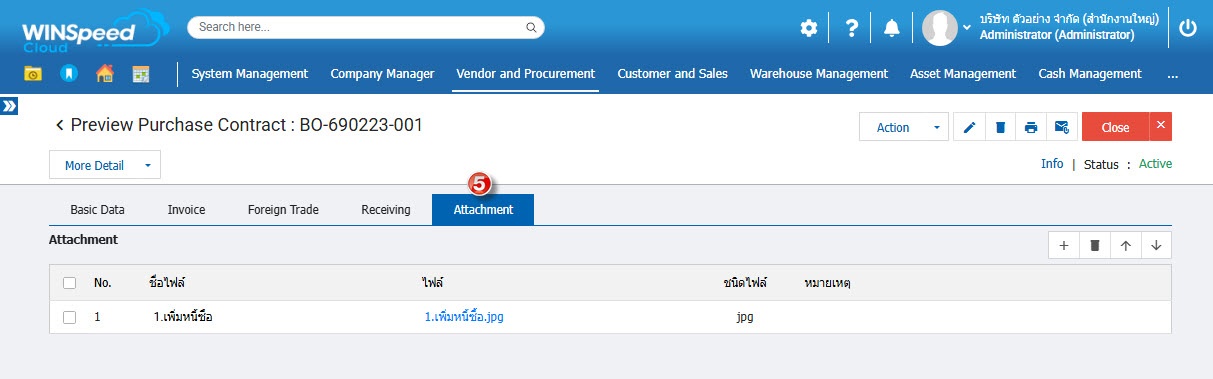 1.สามารถเข้าที่ระบบ Vendor and Procurement -> Transaction -> สัญญาซื้อ2.จากนั้นโปรแกรมจะขึ้นหน้าต่าง “สัญญาซื้อ” ผู้ใช้ New เพื่อไปบันทึกข้อมูลใบเพิ่มหนี้การซื้อตามตัวอย่าง3.Basic Data บันทึกรายละเอียดเพิ่มเติมสำหรับใช้ในการบันทึกสัญญาซื้อเช่น ประเภทสัญญา เลขที่เอกสาร สินค้า และจำนวน เป็นต้น4.Invoice บันทึกรายละเอียดเพิ่มเติมสำหรับใช้ในการบันทึกข้อมูลเจ้าหนี้เพิ่มเติม เช่น เงื่อนไขการชำระเงินให้ผู้ขาย เงื่อนไขการขนส่ง หน่วยงานจัดซื้อ งวดการจ่ายเงิน 5.Foreign Trade บันทึกข้อมูลสกุลเงิน,อัตราแลกเปลี่ยน กรณีเป็นการซื้อจากผู้ขายต่างประเทศ6.Receiving บันทึกเงื่อนไขการรับชำระ และสถานที่รับสินค้า7.Attachment ใช้สำหรับกรณีต้องการแนบไฟล์เอกสารให้กับหน้าจอใบเพิ่มหนี้การซื้อ เลขที่นั้นๆ สามารถแนบไฟล์ เช่น Word Pdf Excel รวมถึงไฟล์รูปต่างๆ