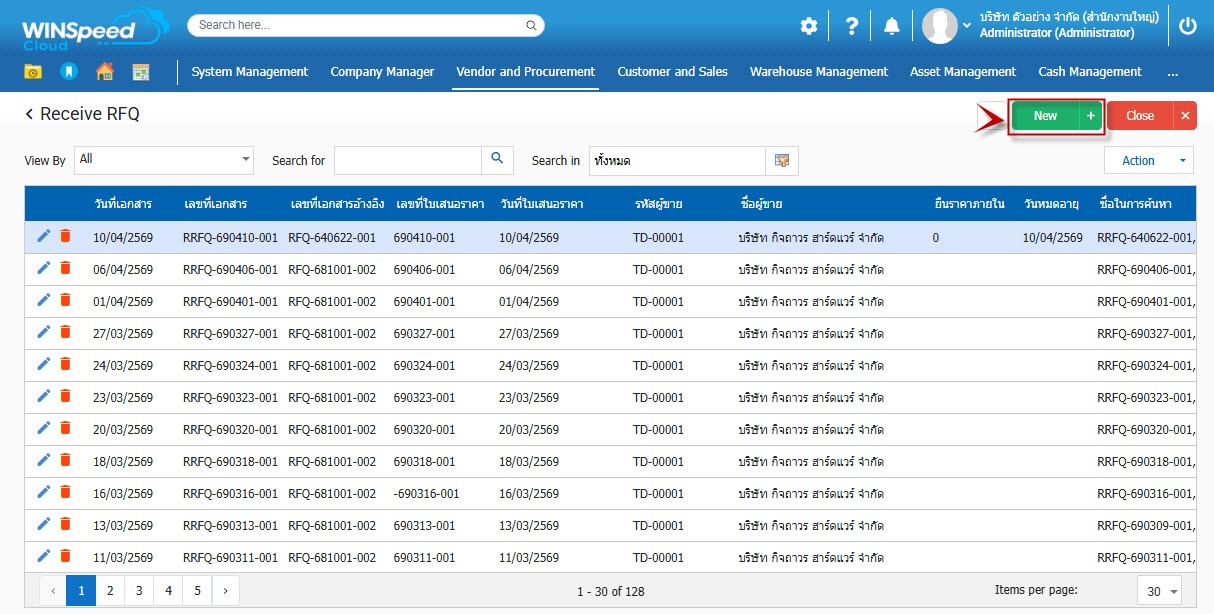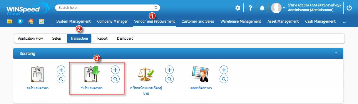 1.สามารถเข้าที่ระบบ Vendor and Procurement -> Transaction -> รับใบเสนอราคา