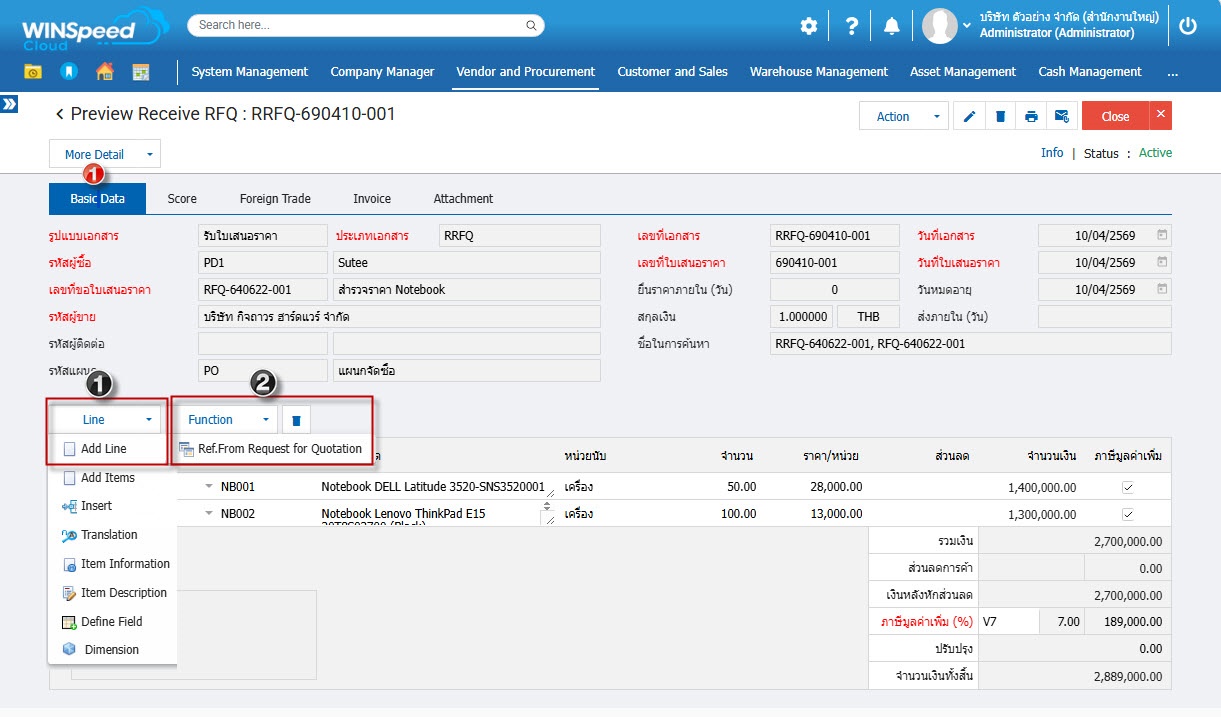 3. Basic Data บันทึกรายละเอียดรับใบเสนอราคาเช่น รูปแบบเอกสาร เลขที่เอกสาร วันที่เอกสาร สินค้า จำนวน ราคา เป็นต้น