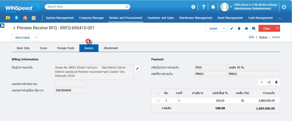 6. Invoice บันทึกข้อมูลที่เกี่ยวกับผู้ขายเพิ่มเติม ได้แก่ที่อยู่ในการออกบิล เงื่อนไขการชำระ งวดการชำระ โดยโปรแกรมเซตข้อมูลเบื้องต้นให้ตามการกำหนดที่ข้อมูลผู้ขาย