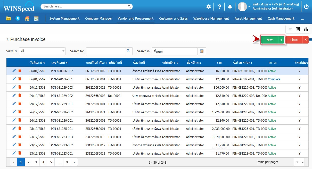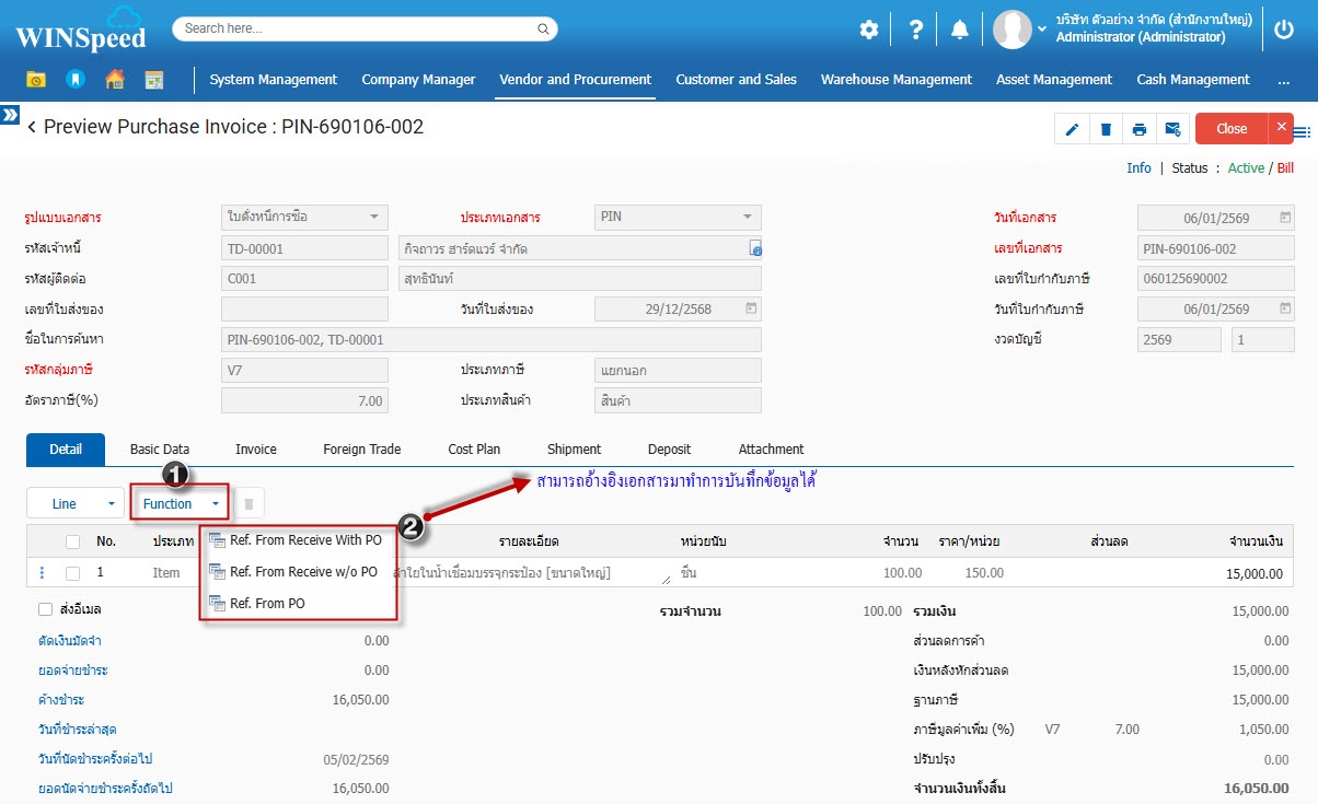 1.สามารถเข้าที่ระบบ Vendor and Procurement -> Transaction -> ใบตั้งหนี้การซื้อ