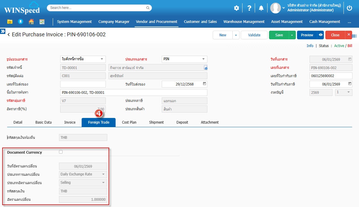6.Foreign Trade บันทึกข้อมูลสกุลเงิน,อัตราแลกเปลี่ยน กรณีเป็นการซื้อจากผู้ขายต่างประเทศ