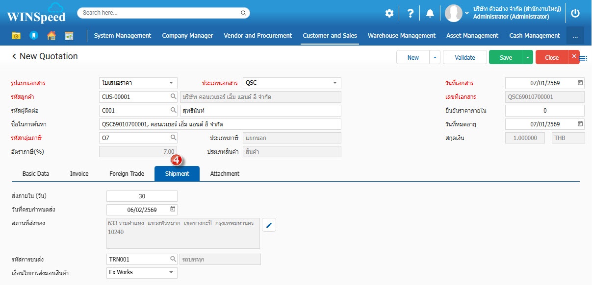 6. Shipment บันทึกสถานที่ส่งของลูกค้า