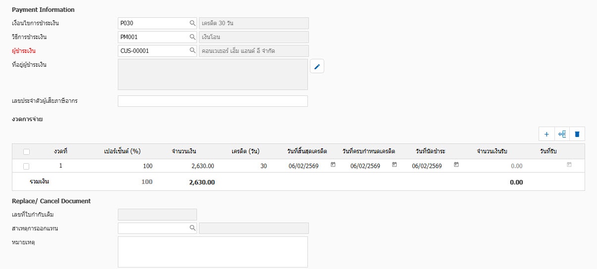 5.Invoice Basic คีย์ข้อมูลที่เกี่ยวกับข้อมูลลูกค้าเพิ่มเติม ได้แก่ที่อยู่ในการออกบิล เงื่อนไขการชำระ งวดการชำระ โดยโปรแกรมเซตข้อมูลเบื้องต้นให้ตามการกำหนดที่ข้อมูลลูกค้า สามารถแก้ไขเปลี่ยนแปลงได้ที่หน้าต่างใบตั้งหนี้การขาย
