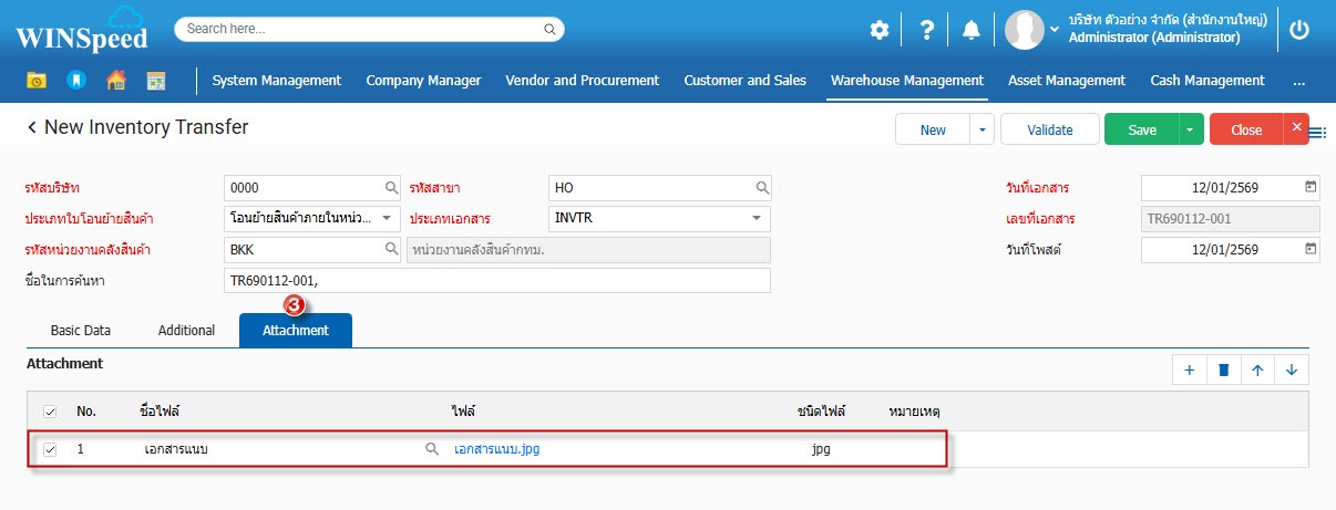 5.Attachment ใช้สำหรับกรณีต้องการแนบไฟล์เอกสารให้กับหน้าจอโอนย้ายสินค้าภายในหน่วยงานเลขที่นั้นๆ สามารถแนบไฟล์ เช่น Word Pdf Excel รวมถึงไฟล์รูปต่างๆ และ ไฟล์ Zip เป็นต้น โดยสามารถจำกัดความจุของไฟล์เอกสารที่ใช้แนบได้