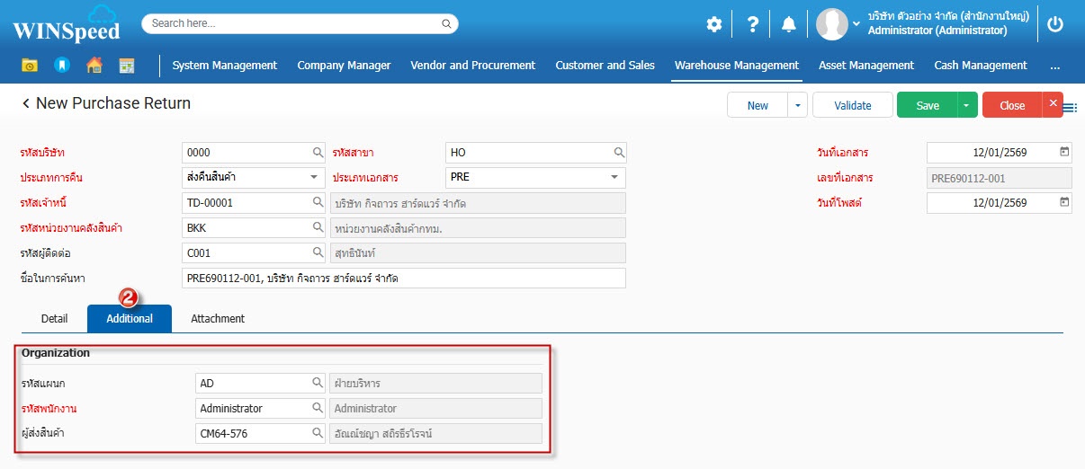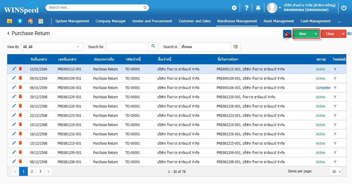 1.สามารถเข้าที่ระบบ Warehouse Management -> Transaction -> ส่งคืนสินค้า