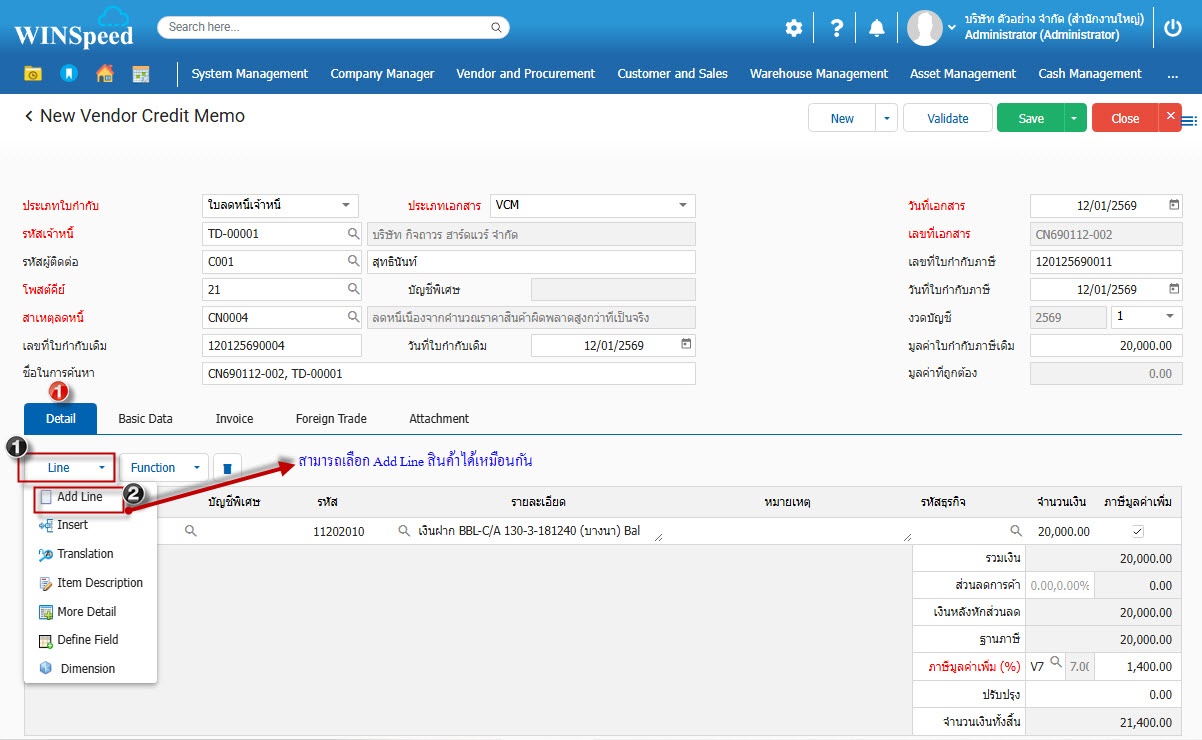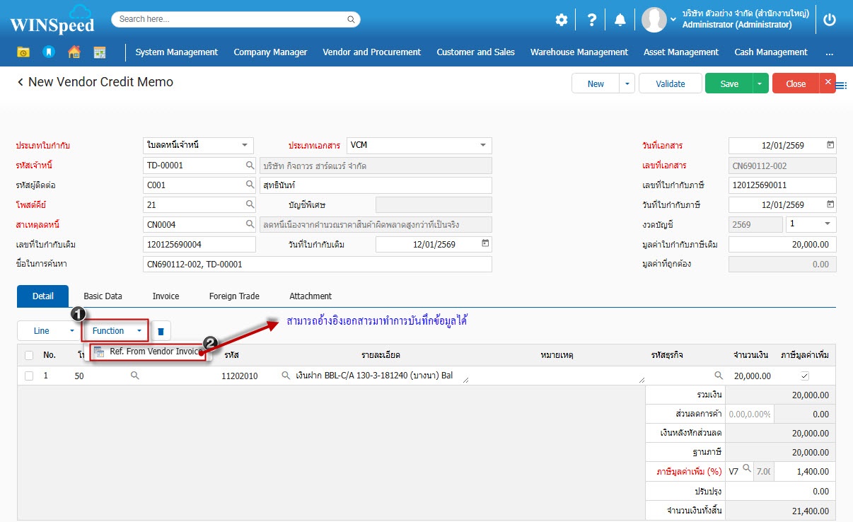 3. Detail Data บันทึกรายละเอียดเอกสารใบลดหนี้เจ้าหนี้ เช่น เลขที่เอกสาร วันที่เอกสารผู้ขาย รายการที่สั่งซื้อ จำนวน ราคา เป็นต้น