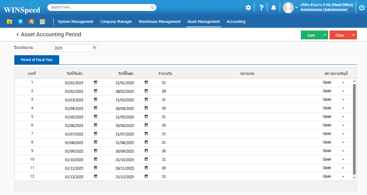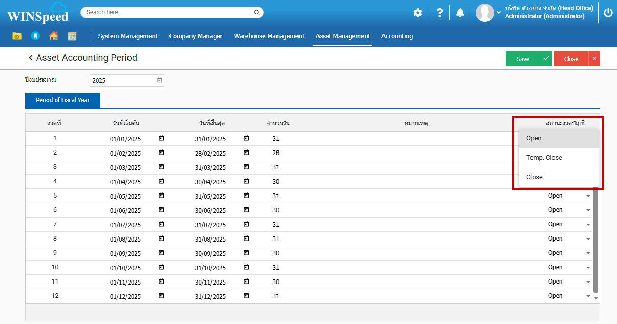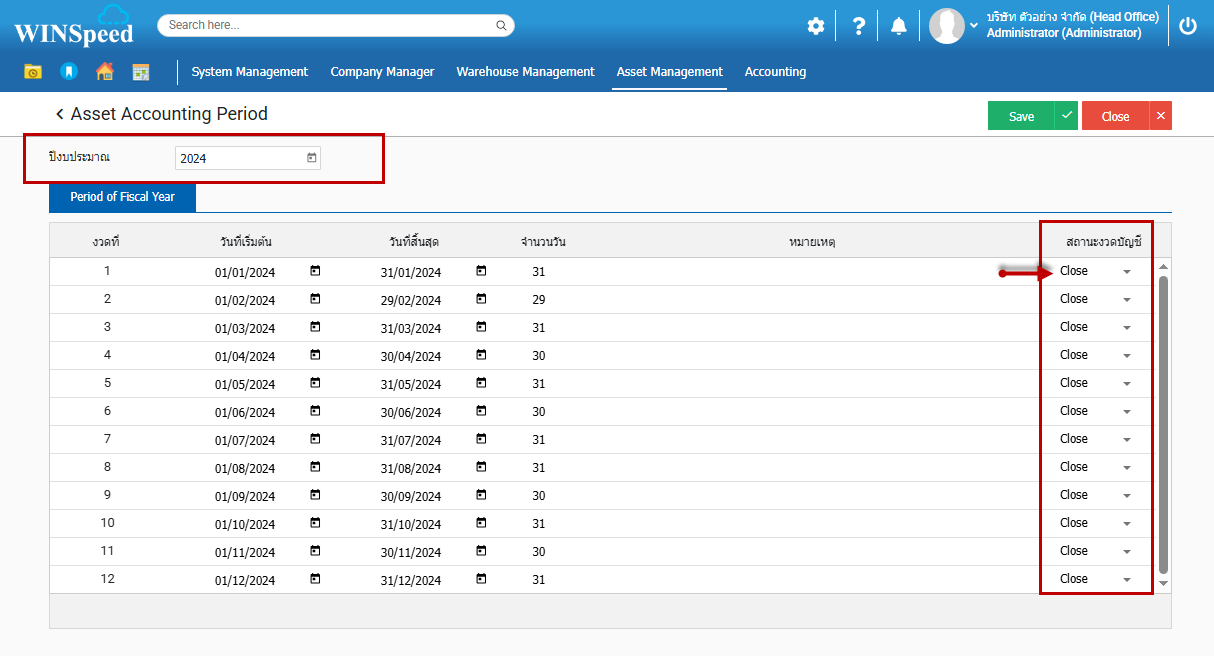 3.จากนั้นให้เลือกสถานะงวดบัญชีเป็น Close เพื่อทำการปิดงวดบัญชีประจำปี