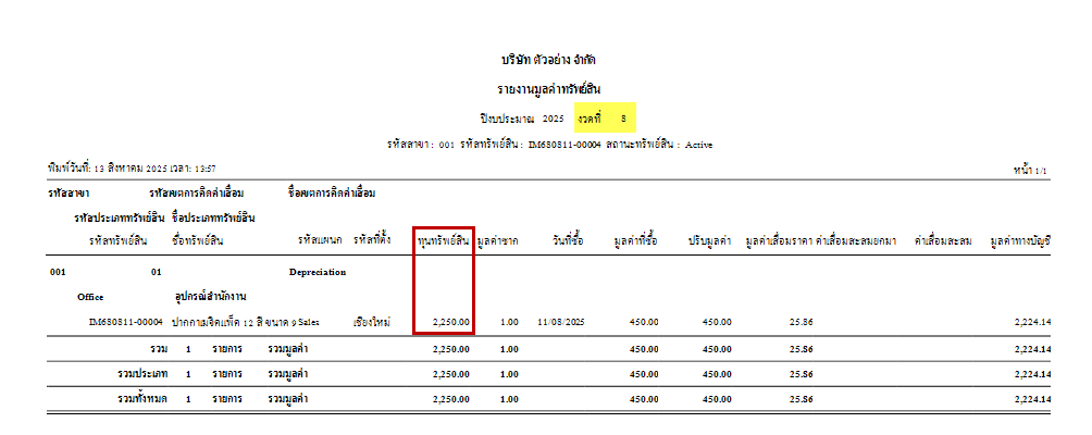 1.เดิมบันทึกทรัพย์สินด้วยรหัส IM680811-00004 มียอดมูลค่าโพสต์อยู่ 2,250 ณ เดือนสิงหาคม 2568