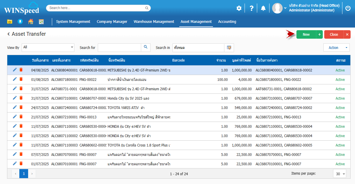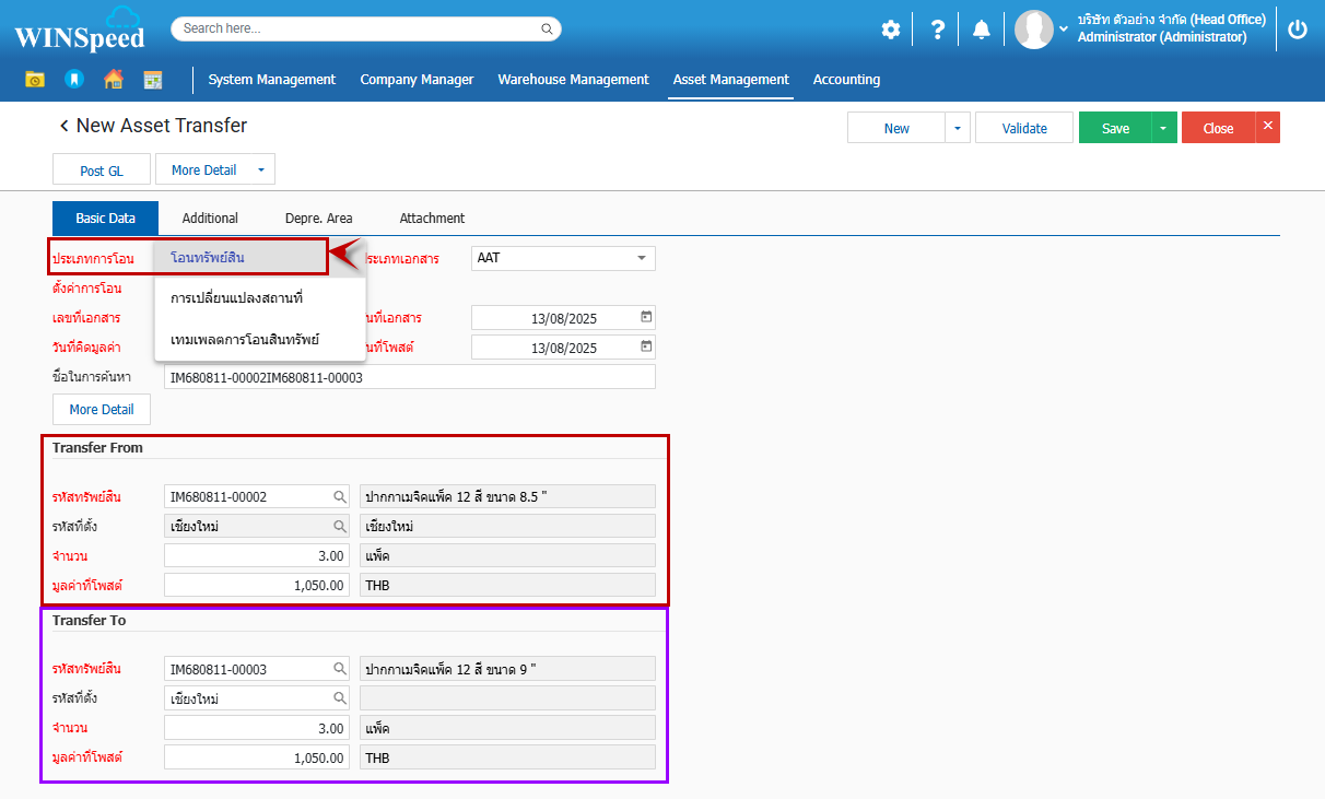 Q: ต้องการโอนทรัพย์สินไปเป็นรหัสใหม่โดยโอนได้ทั้งหมด หรือบางส่วน มีวิธีการทำงานอย่างไร