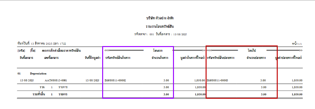 4.เรียกรายงานโอนทรัพย์สิน จะมี โอนจาก และโอนไป ตามข้อมูลที่บันทึก