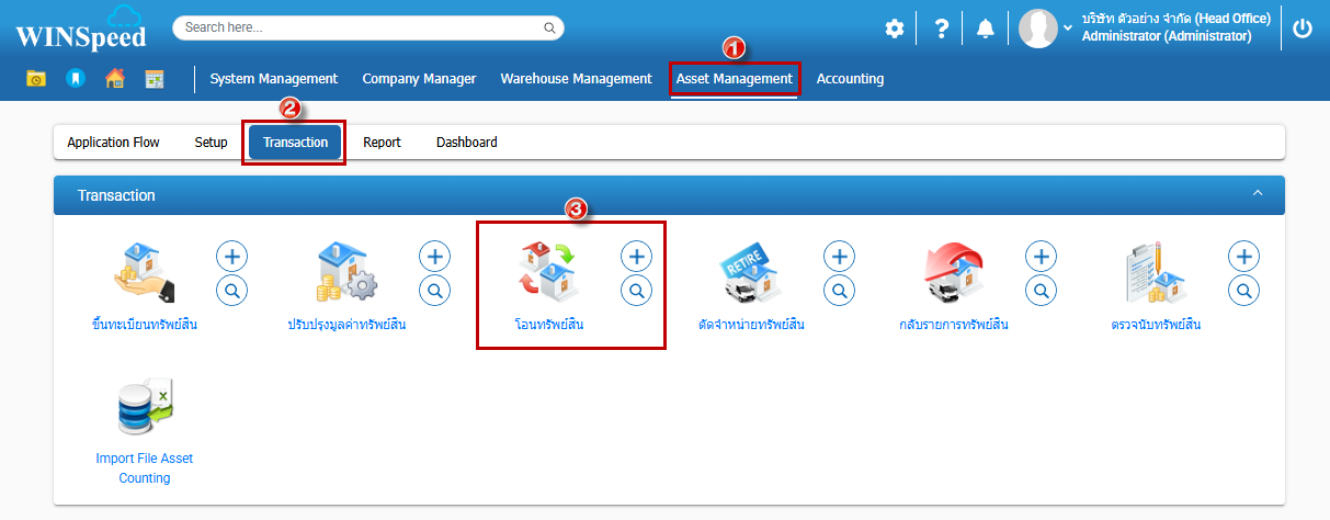 1.ผู้ใช้สามารถเข้าระบบ Asset Management >Transaction > โอนทรัพย์สิน