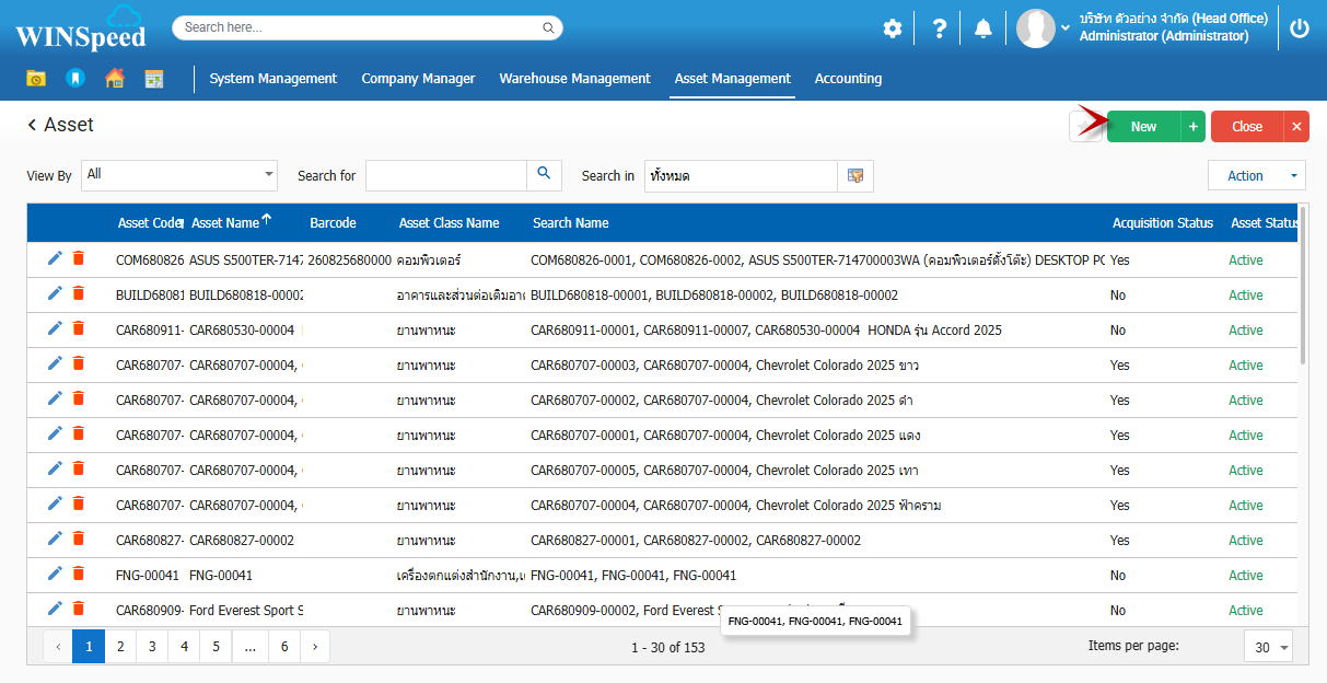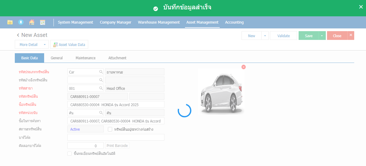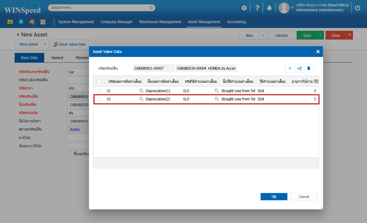 2.จากนั้นโปรแกรมจะขึ้นหน้าต่าง “ทรัพย์สิน” ผู้ใช้ New เพื่อไปบันทึกข้อมูลของทรัพย์สิน ตามตัวอย่าง 3.Tab Basic Data จากนั้นทำการบันทึกทรัพย์สินใส่รายละเอียดตามรูป 4.Tab General เป็นการบันทึกรายละเอียดของมูลค่าของทรัพย์สิน จำนวน และรายละเอียดเลขที่รุ่น เป็นต้น 5.จากนั้นไปที่ Asset Value Date เพื่อไปทำการกำหนดเขตการคิดค่าเสื่อมของการคำนวณ 6.เมื่อกำหนดแล้วจะได้ดังรูปภาพ 7.จากนั้นทำการบันทึกข้อมูล 8.รายละเอียดจะโชว์ที่ทรัพย์สินตามรูปภาพ