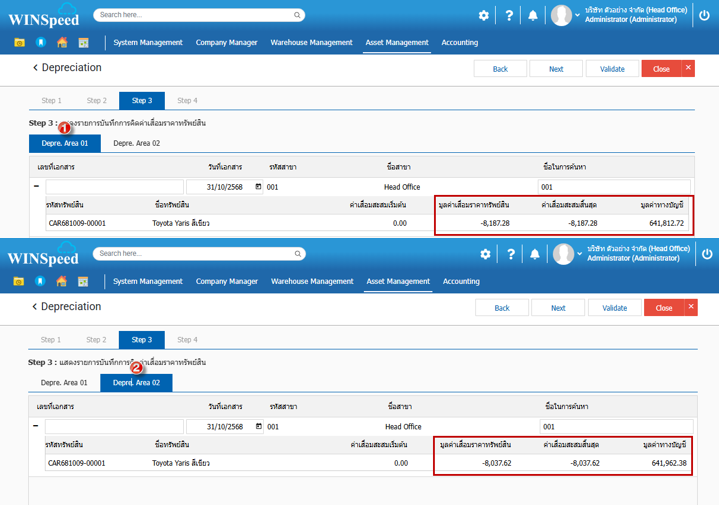 3.Next คำนวณค่าเสื่อมทรัพย์สิน : Step2 จะขึ้นรายการทรัพย์สินที่จะคำนวณโดยจะโชว์ 2 แถบที่เป็นเขตคิดค่าเสื่อม เพื่อเห็นความแตกต่างในการคำนวณค่าเสื่อมตรวจสอบทรัพย์สินสำหรับคำนวณค่าเสื่อม Area 1/ Area 2