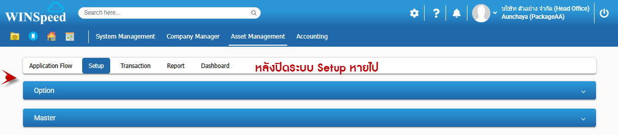 11.หลังจากมีการกำหนดตามข้อ 9 เรียบร้อยแล้ว ให้ทางผู้ใช้งาน Log Out ออกจากโปรแกรมและทำการ Login เข้ามาใหม่ด้วย Users ที่มีการกำหนดสิทธิ์ไว้ จะสังเกตได้ว่าModule Chart Of Depreciation ที่อยู่ใน Setup หายไป