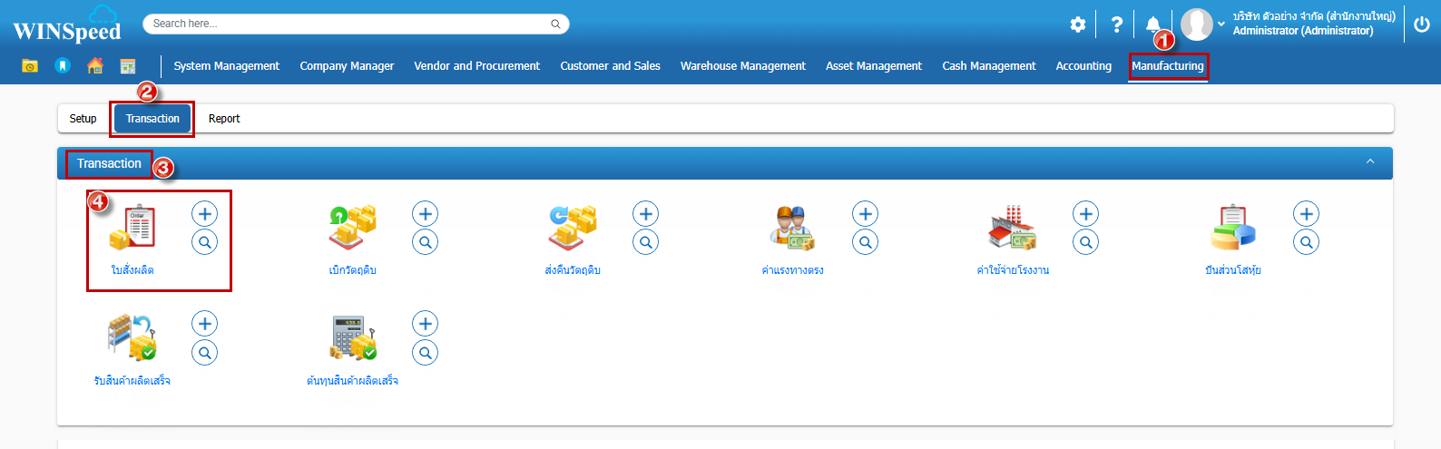 1.สามารถเข้าที่ระบบ Manufacturing > Transaction > Transaction >ใบสั่งผลิต