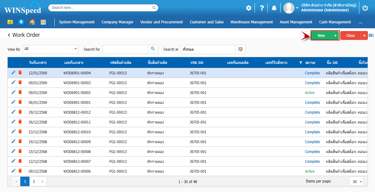 2.จากนั้นโปรแกรมจะขึ้นหน้าต่าง “ใบสั่งผลิต” ผู้ใช้คลิก New จะขึ้นหน้าต่างตามรูปภาพที่ 3