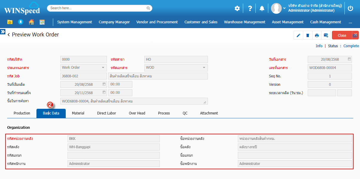 4. Tab Basic Data บันทึกรายละเอียดเพิ่มเติมสำหรับใช้ในการบันทึกใบสั่งผลิต เช่น รหัสหน่วยงานคลัง, รหัสคลัง,