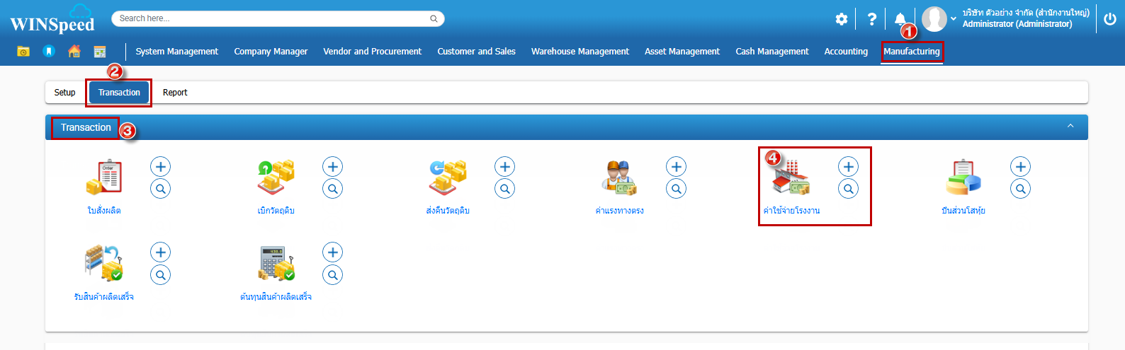1.สามารถเข้าที่ระบบ Manufacturing > Transaction > Transaction >ค่าใช้จ่ายโรงงาน