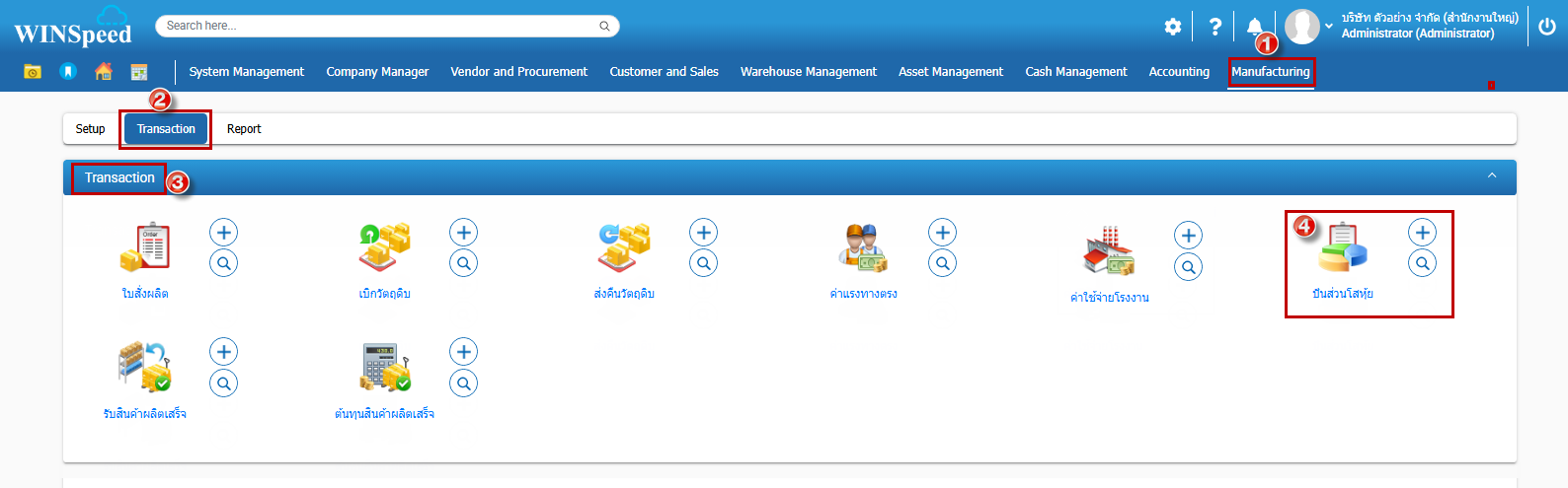 1.สามารถเข้าที่ระบบ Manufacturing > Transaction > Transaction >ปันส่วนโสหุ้ย