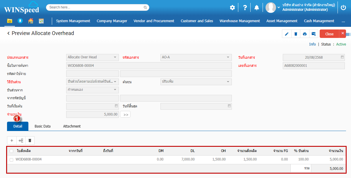 3. Tab Detail เพื่อบันทึกใบสั่งผลิตและจำนวนเงินที่ปันส่วนโสหุ้ย