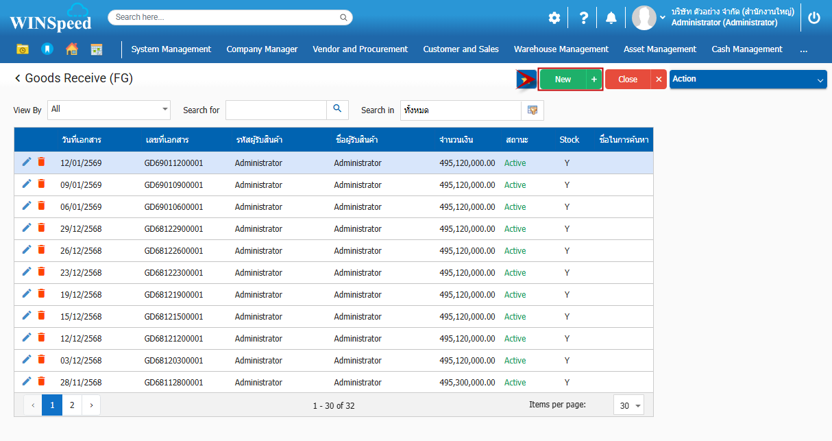 2.จากนั้นโปรแกรมจะขึ้นหน้าต่าง “รับสินค้าผลิตเสร็จ” ผู้ใช้คลิก New จะขึ้นหน้าต่างตามรูปภาพที่ 3