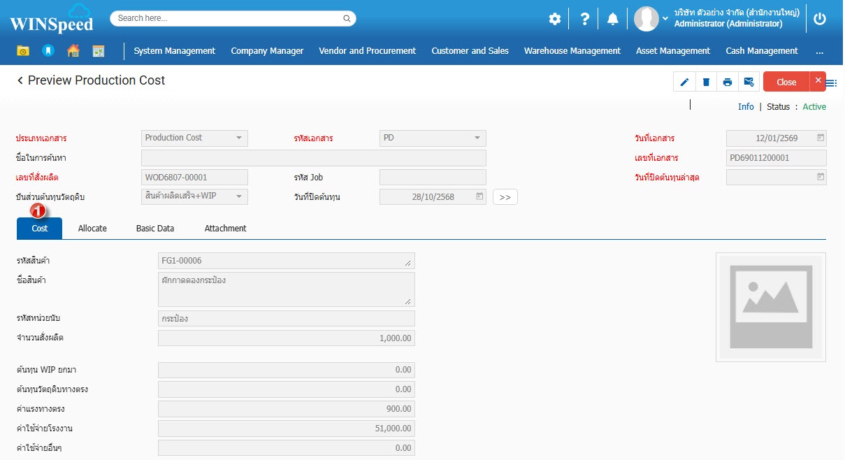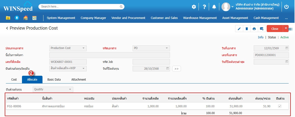4. Tab Allocate เป็นการบันทึกจัดสรรปันส่วนต่างๆของต้นทุนสินค้าผลิตเสร็จ